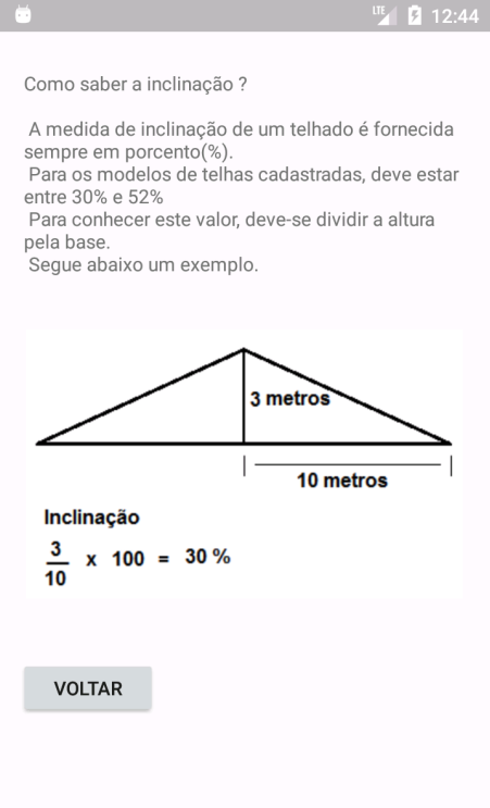O aplicativo possui um cadastro, com vários tipos de telhas e seus respectivos consumos, por metro quadrado.