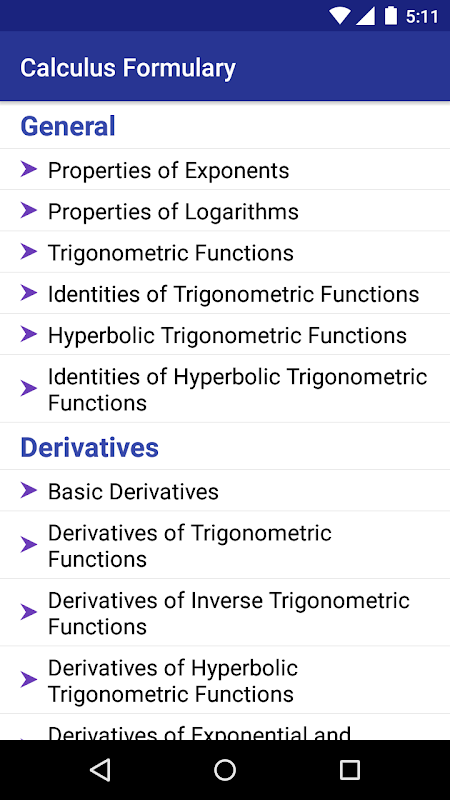 Calculus formulary is an app that brings a quick reference to formulas of derivatives, integrals and other basic topics to your smartphone.