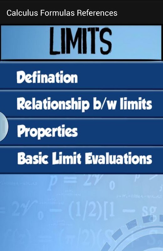 Calculus formulas references is for mathematics students to look up the definitions and calculus formulas in a second. Calculus formulas references is designed for mathematics students, helping them in their studies.