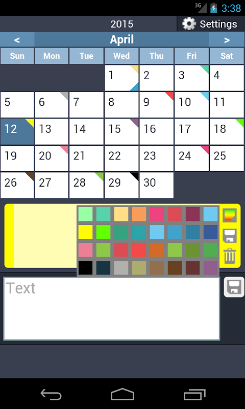 Customize notes with eye-pleasing colors, and enjoy the convenience of a colored triangle appearing next to each day with a note.