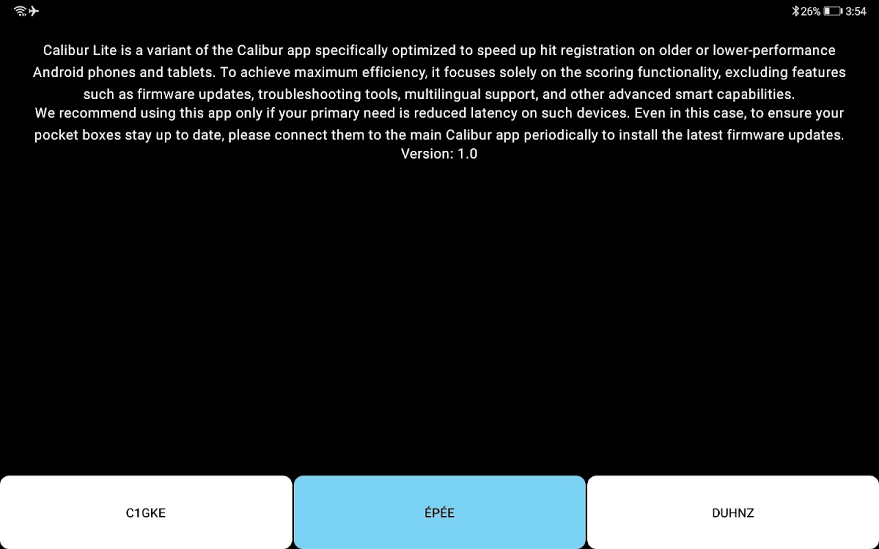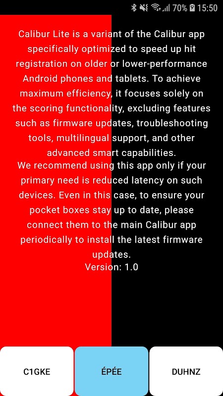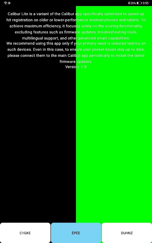 Calibur Lite lets you use your phone or tablet as a wireless scoring machine for épée, foil, and saber fencing. To use the app, you’ll need a pair of our compact hardware devices – the pocket boxes – which create a wireless connection between the fencers’ weapons and your phone or tablet.