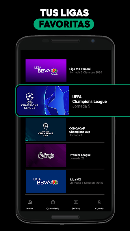 · Amplia selección de ligas nacionales e internacionales, incluyendo la Liga MX, CONCACAF Champions Cup ,Premier League, UEFA Champions League, Ligue 1 de Francia, FA Cup, Coppa Italia, Saudi Pro League y otros torneos destacados del calendario internacional.