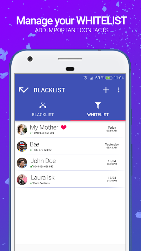 Call Blocker had a beautiful ' Material Design " that allows to users a simplicity use. You can "add" a number or someone from your contacts in one step in your private blacklist and you will never see them on your list. Manage your Whitelist for VIP, Make a list for important persons such family and friends so they can reach you at any time.