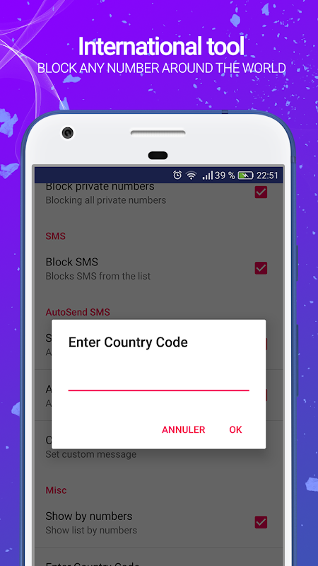 block calls or SMS from any place in the world. Stop any annoying number, private number or simply a contact that you don't want to answer. You can also manage SMS features with this call blocker App.