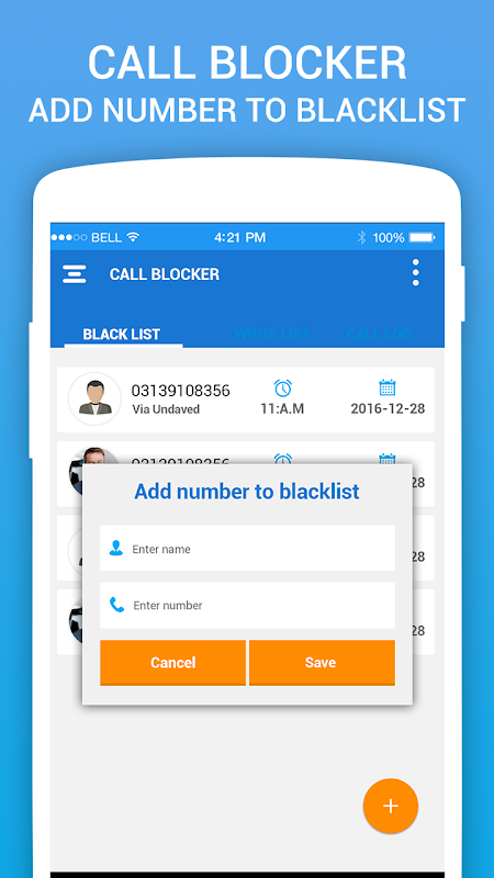 ★ Blacklist: Open the app, tap Plus Button and add phone number from: