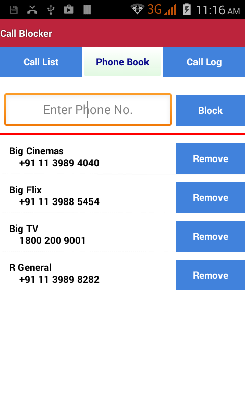 Call Log-This list provides the records of the block calls and also give the direct call option from the list.