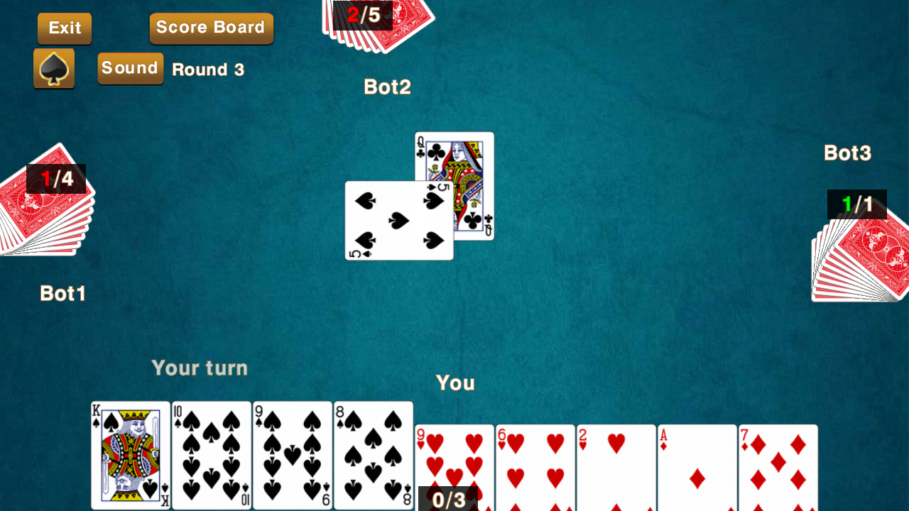 Call Break is a strategic trick-based card game played by four players with a standard deck of 52 playing cards.There will be five round in a game. Starting a game with a bid/call, a player can compete against 3 computer players with effective artificial intelligence. Initiating a game by throwing a single card of any suit (club,diamond,heart,spade), the other players also follow the same suit unless they runs out of that particular suit. Absence of identical suit allows player to throw a card of another suit and the current round is won by highest card. Spade cards can be used to conquer other cards when no more cards of the same suit are there to offer.e.g. 2 of spade can conquer any higher cards of other suits. If all the players run out of both identical led suit and Spades card then the led card wins regardless of any suit.