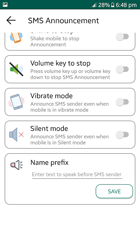 This caller name announcer 2019 have this awesome feature Shake to stop Caller name announcement / SMS sender name announcement .Enable this features from caller announcement settings / SMS announcement settings respectively and just shake your mobile to stop announcement / talking