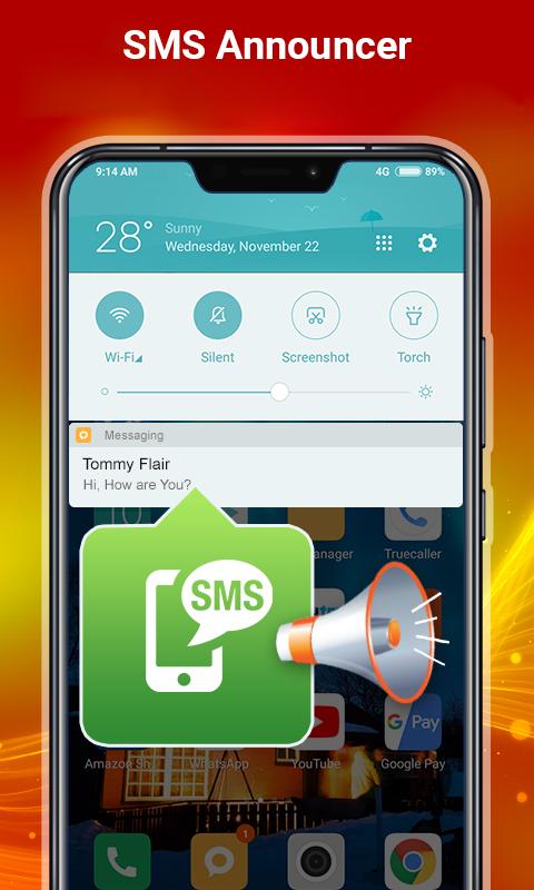 Caller Name Announcer Speaks Caller Name of Incoming Phone Call, SMS Sender Name & reduce its ringtone volume.