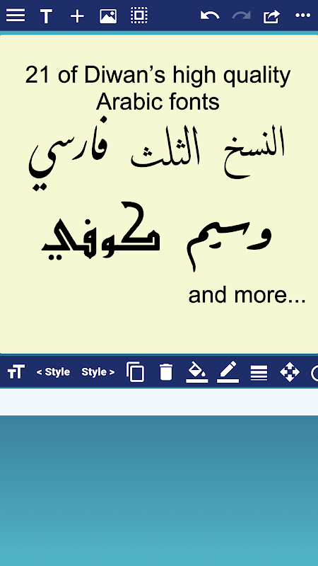- Choose from a collection of 21 fonts including Diwan's most advanced Arabic fonts like Diwan Naskh Mishafi, Diwan Thuluth, Diwan Farsi, Waseem (Ruqa’a like font), Kufi, and more.
