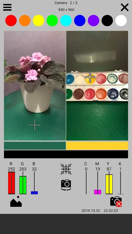 Target the camera at the object, get RGB and CMYK color. Everything is simple!