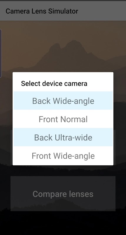 Application for photography enthusiasts. Helps you understand the viewing angle of the selected lens. Enter camera parameters (sensor size in mm) manually or from a predefined list, specifying lens parameters, minimum and maximum focal length in mm. Lens simulation using the phone's built-in camera graphically displays the viewing angle. If the camera angle of view of the phone is wider, its image is reduced accordingly.