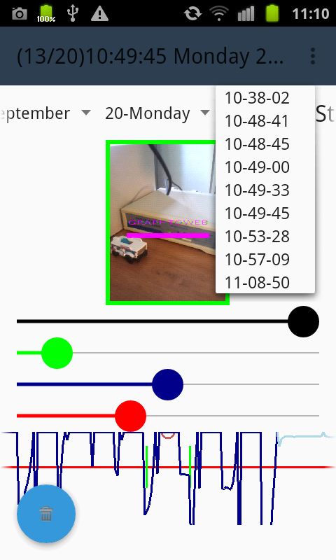 The motion detection algorithm is easily tunable thank to a real time graphics which display the detector response. Tuning of the detector is simply done with four spinners. The red spinner is allowing to setup the minimum value for triggering an alarm event. The blue spinner is scaling the amplitude of the curve. The green spinner is filtering the events (according to width) which will produce an alarm. The black spinner is smothering the sensor value. Spinner can be locked and unlocked with long press.