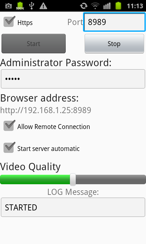 When the phone is connected to a Wi-Fi router, video and alarm signal of the mobile phone can be monitored on any browser at a remote location. The connection is secure with username and password being respectively “root” and “admin”. The password should be changed and can be displayed with a long press on the title “Administrator Password”. Old video sequence can be reviewed and deleted as well. The monitor web pages will enable to create its own alarm.