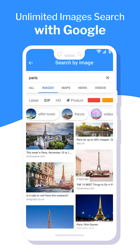Moreover, this Google Image Search Tool, Google search by image, photo search, image search with google, picture finder, search images lets you save unlimited your search history.