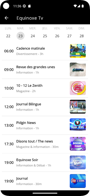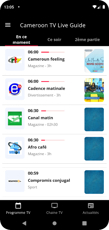 Cameroon TV Live Guide Guides you every day in the TV offer of many local channels (Crtv, Canal 2 international, equinoxe TV, vision 4, VoxAfrica etc) and international (Novelas TV, Nollywood TV, ZEE Magic, Mangas, GAME ONE, etc).