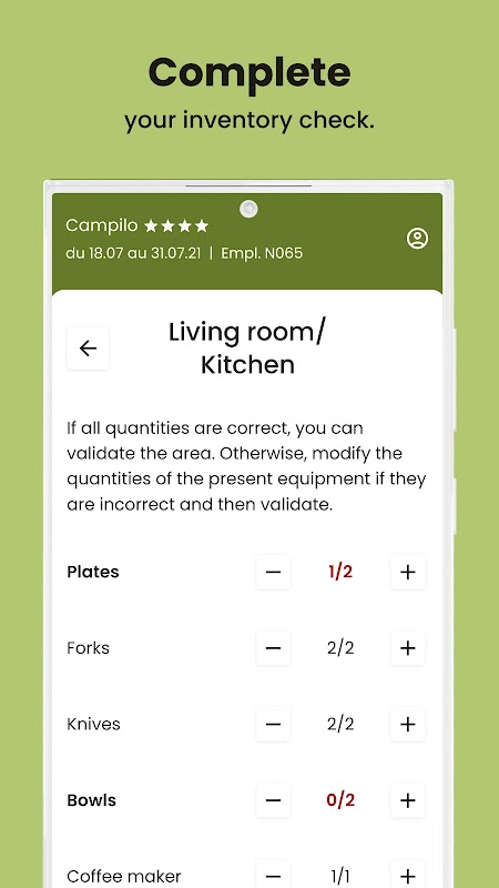 No more waiting and going back and forth to reception! From now on, you can carry out your inventory of fixtures and fittings on your own in just a few minutes. Check the list of equipment in your home via the app, and let us know if any utensils are missing or if your home is clean, without even having to go anywhere!