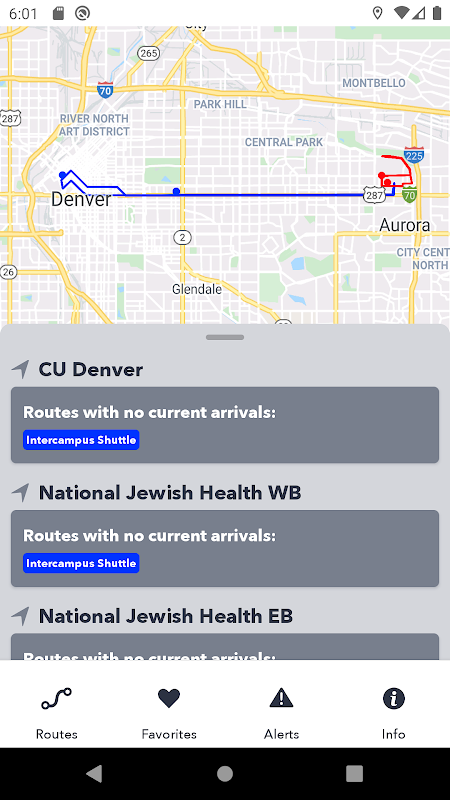 Additionally, with this app University of Colorado employees and students can track the Employee/Student Intercampus Shuttle that connects the Anschutz Medical Campus with the VA Medical Center, National Jewish Health and the Denver Campus. Everything you need with constant updates.