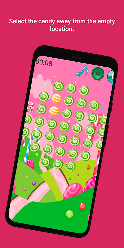 Select the candy away from the empty location. Then select the empty location. The selected candy will jump over the adjacent one to the empty location (now the pattern will be "empty-empty-candy" or "candy-empty-empty"). The middle candy gets removed by this. Similarly, go on removing the candies one by one till you reach a state when there are no two candies together with an adjacent vacant position.