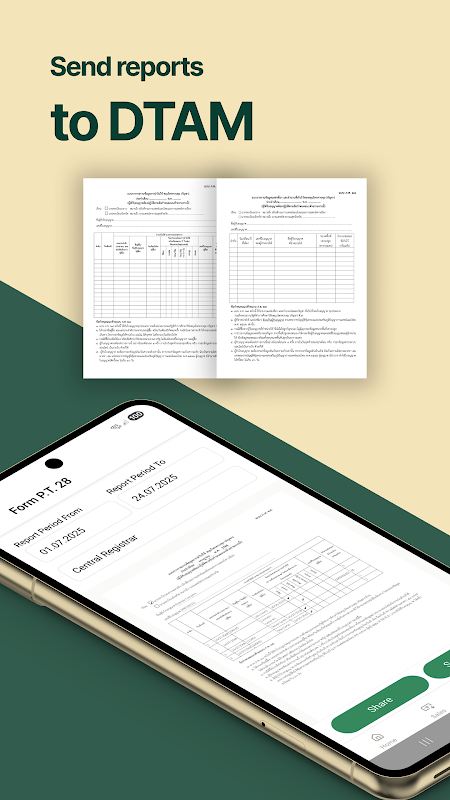 Create DTAM-compliant reports (แบบ ภ.ท. ๒๗ and แบบ ภ.ท. ๒๘) instantly with just a tap. No spreadsheets, no guesswork — just clean, export-ready documentation aligned with Thai regulations.