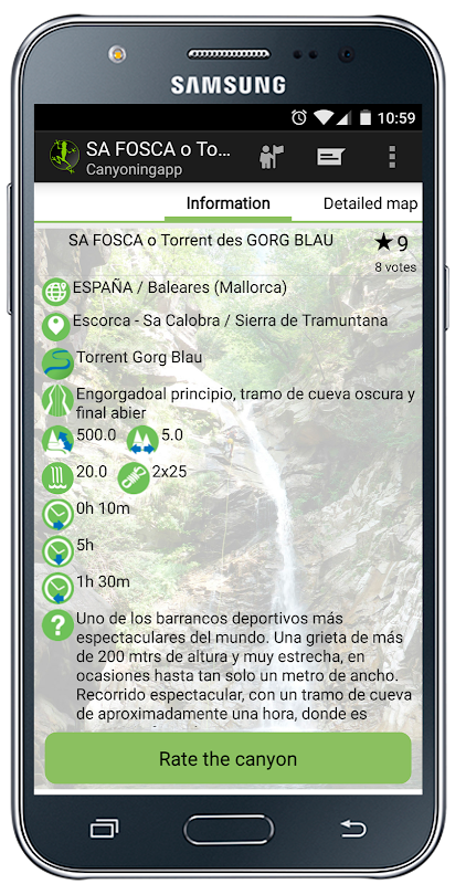 Comment, evaluate and check the information from other users about the canyons you want, so you can know the state of it in real time and canyon without any surprises. You can record the descents you have made so you have a log of your activities.