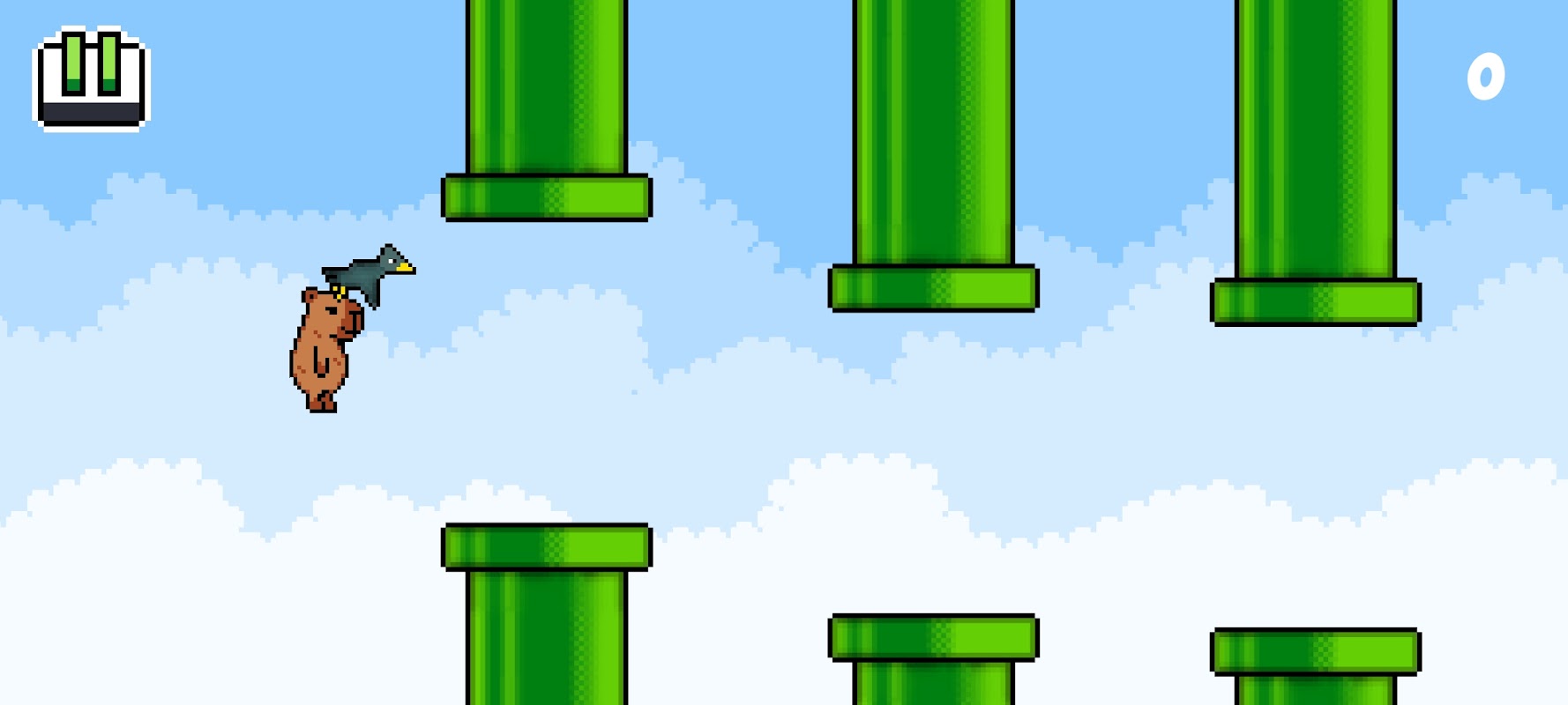 It is about a capybara that goes in its habitat eliminating the enemies that fall anywhere on the map, but if time runs out you will be struck by lightning that will turn you into one of them, in the next game mode you are escaping from those enemies until you reach a desert where you will face obstacles such as cacti and birds, in the third game mode you have already tamed the bird and it helps you to pass between the tubes.