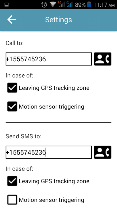 - In the alarm system mode the application defines the GPS tracking zone (current GPS coordinates + tracking zone radius) and notifies the user in case of leaving this zone.
