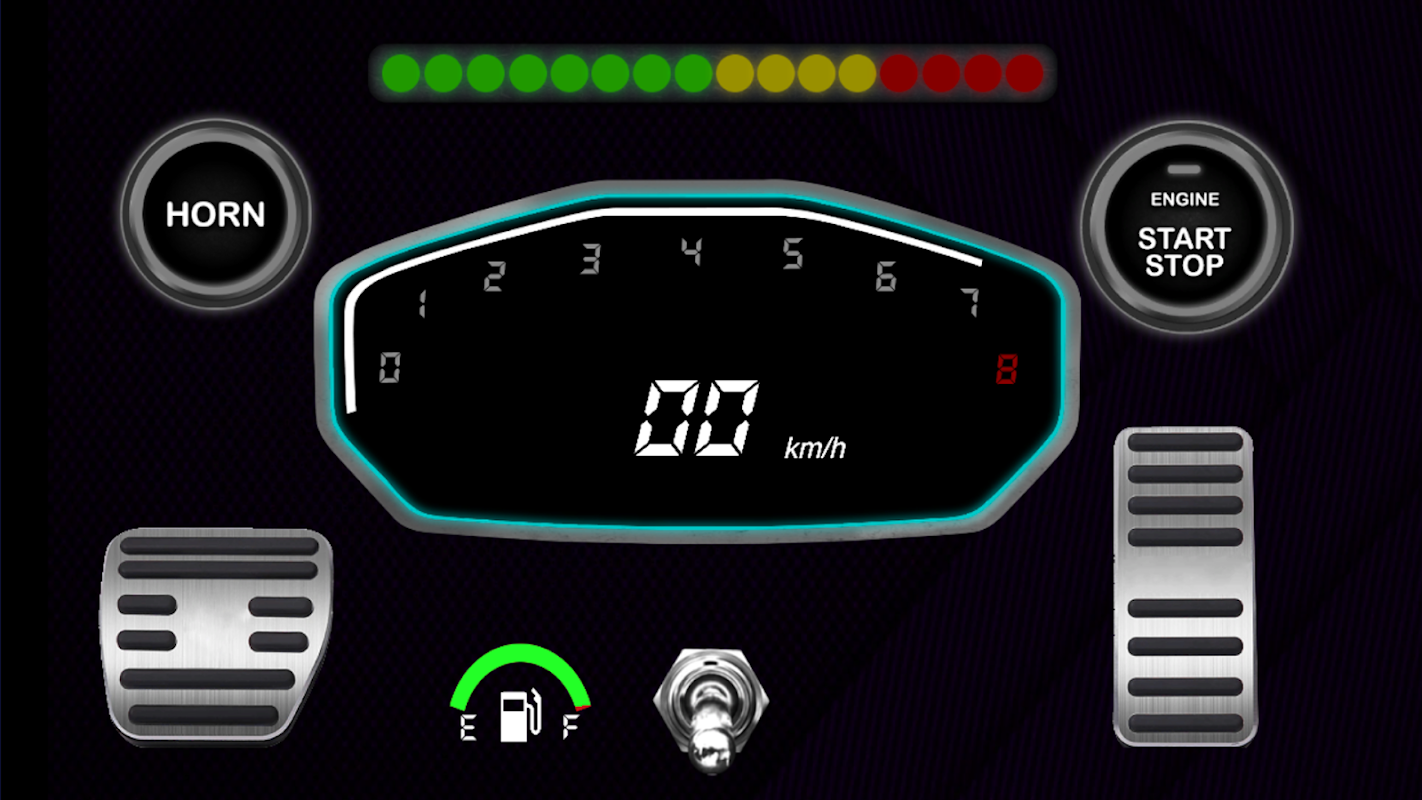 Realistic engine sound effects and car simulator with gas pedal and speedometer.