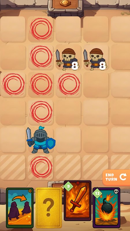 Choose your cards wisely each turn — launch bombs, slash with fiery swords, reposition yourself, or support your next move with buffs. Every turn is a puzzle and every card is a tool.