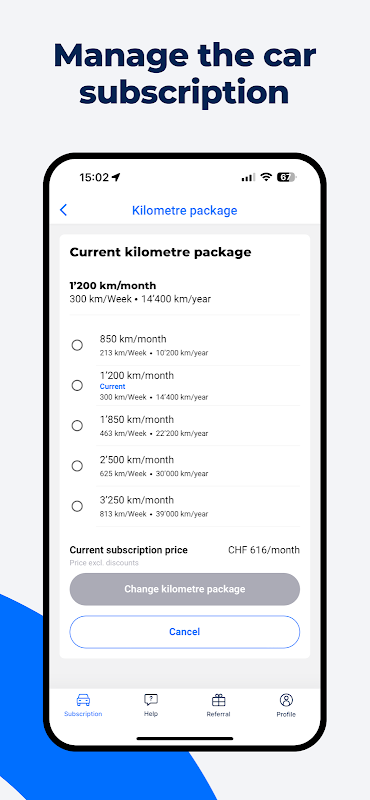 With the Carvolution app, you have all the important information about your car subscription at a glance with ease and paperless. In the kilometre overview, you can find the kilometres you have driven so far and whether they match your selected kilometre package. This means you always have an overview of your kilometres and can make changes to your kilometre package as required, whether upwards or downwards.