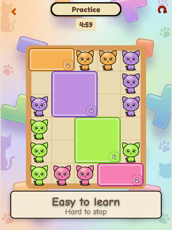 Catch the Cats is a cozy cat puzzle game you can finish in a minute… and keep playing for hours. It’s a fresh mix of block puzzle + color-matching logic: drag chunky, tetris-like pieces across a grid, match the right color, and catch cats by clearing them from your path. Every move is precise, every catch feels great, and the difficulty ramps up fast.