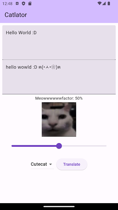 This app allows you to translate text into either "lulcat" or "cutecat", a sarcastic language used by chronically online people.