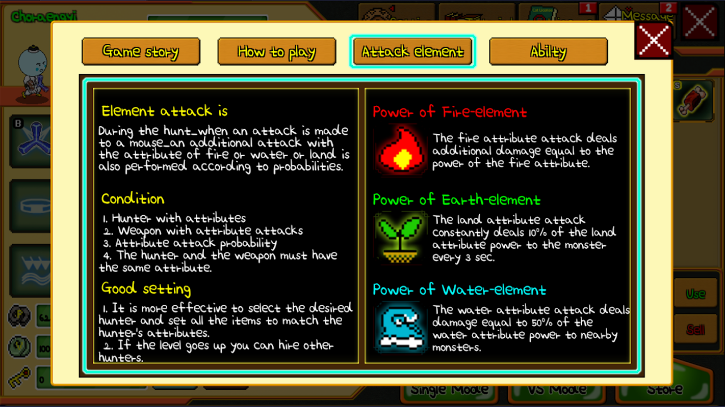 Cats have one attribute of fire, earth, and water, respectively, and when hunting after wearing a weapon with the same attribute, elemental attacks occur with a certain probability.