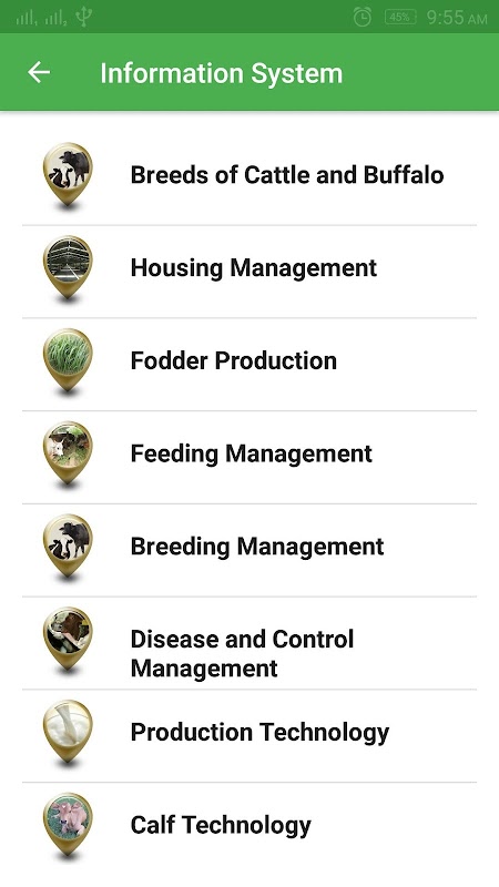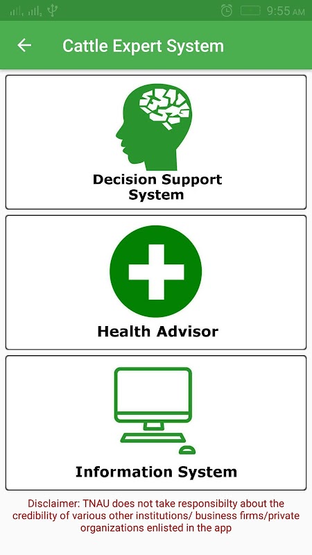 TNAU's cattle expert system is a mobile app that covers Feeding Management for Cattle and Buffalo, Breeding sManagement for Cattle and Buffalo, Disease and Control Management for Cattle and Buffalo, Production Technology for Cattle and Buffalo, Calf Management for Cattle and Buffalo, General Care and Management for Cattle and Buffalo, Common Management and Practices for Cattle and Buffalo and Farm Machineries for Cattle and Buffalo