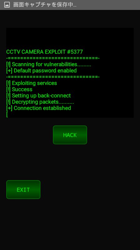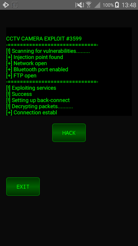 "CCTV Camera Hacker Simulator" shows you a text area and on your command of the "hack" button will being the "hacking", with hack text being typed out! You will then be taken to the hacked CCTV cameras!