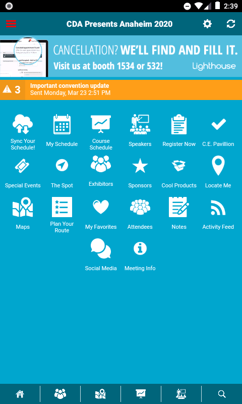 Before CDA Presents, use the app to plan your itinerary and access course information. Once you’re there, search for open lectures and workshops, download available course handouts, verify C.E. scans and even take lecture notes within the app. In the exhibit hall, find your favorite exhibitors and products and use the app’s interactive map to quickly reach your destination. Plus, keep connected to live updates throughout the convention.