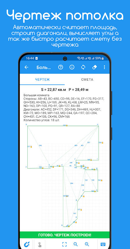 • Display of side lengths, diagonals, and the number of corners on the blueprint.