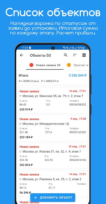 • Project lists - A clear display of all projects with sorting, search, and grouping by stages. You can track the status, area, and perimeter of each project, as well as receive overall information for each stage.