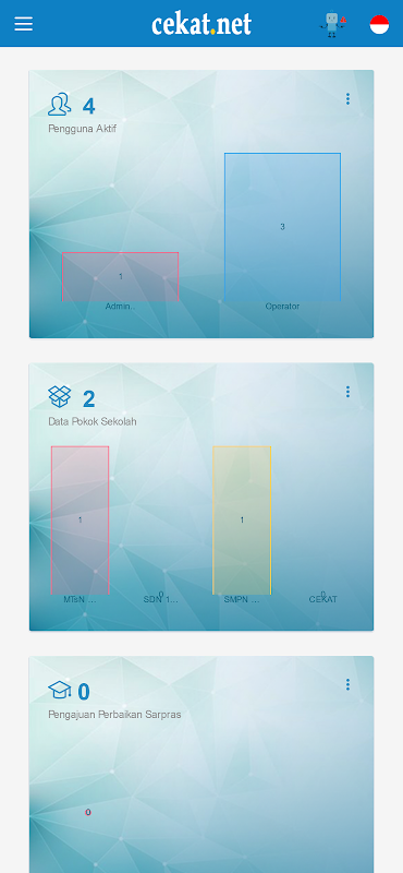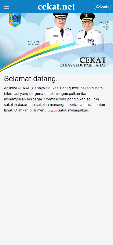 Aplikasi CEKAT (Cahaya Edukasi Lahat) merupakan sistem informasi yang berguna untuk mengumpulkan dan menampilkan berbagai informasi data pendidikan seluruh sekolah dasar dan sekolah menengah pertama di kabupaten lahat.