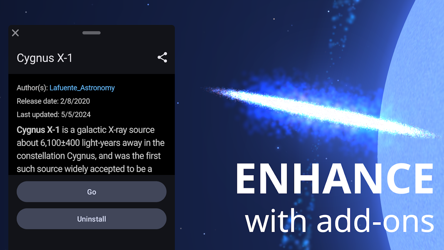 Celestia’s catalogues can be easily expanded. There are many different add-ons available containing new objects like comets or stars, high-resolution textures of Earth and other well mapped solar system bodies, as well as 3D models for asteroids and spacecraft on precise trajectories. Even fictional objects from well-known sci-fi franchises can be found.