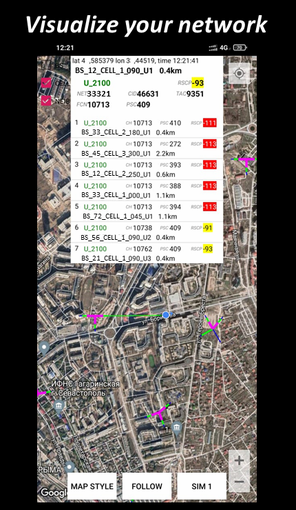 Its a Net Monitor (field test) tool for cellular network investigation with cells visualisation on map. You can see all your network and check serving cells. Its a net monitor with engineering data. But you have to create cell file first. Need to collect all your engineering data and network data. Connect BS name, cell name with geo coordinates, azimuths, cell id, LAC, and name of technologies. Technologies must be 3 types only: GSM, UMTS, LTE. Excel must be have 8 or 10 columns: