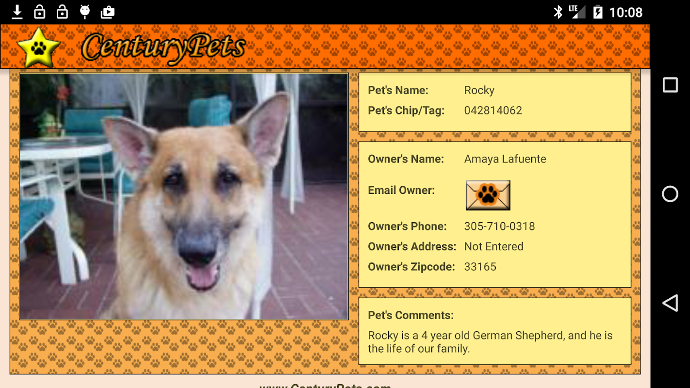 CenturyPets allows us owners the ability to increase our chances of finding our loved ones by giving those who find them one more way to trace them back to us. In the event someone or a shelter finding your pet and scanning the chip number by searching our database they can easily contact you.
