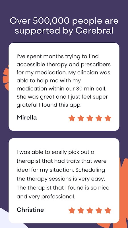 Cerebral’s national network of licensed, credentialed, trained, and experienced mental health care doctors and therapists make direct one-on-one high-quality mental health care accessible and affordable to anyone, anywhere. Our healthcare professionals offer a safe, non-judgmental space for you to be heard and get the professional care you need. To date, our licensed/credentialed tele mental health care professionals have helped over 250,000 patients through their mental health journey. Now it's your turn.
