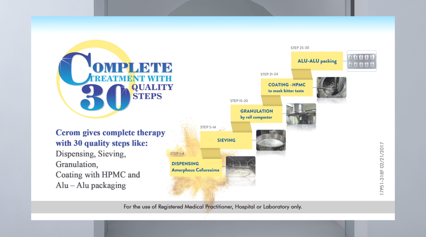 While there may be several options of Cefuroxime available to doctors, Abbott ensures that only a high quality product reaches the consumer. Using high quality & a rigorously monitored process Abbott ensures that the quality is engrained, in every step of the manufacturing process of Cerom.