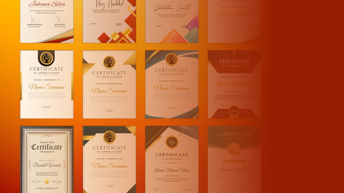 Create certificates in both portrait and landscape versions and download print-ready high-resolution files for free.