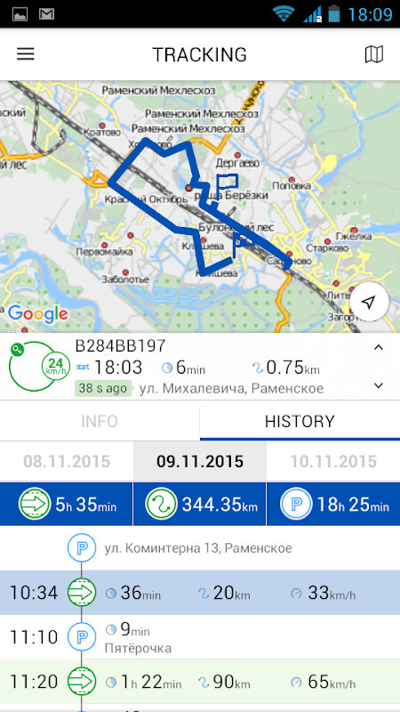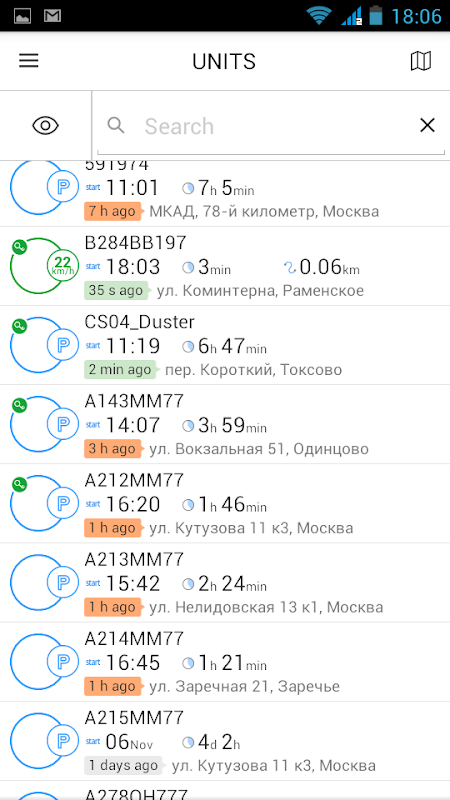 The application displays online information about each object of monitoring: location, speed and the latest values of the sensors, as well as gives an opportunity to see, in chronological order on the map of the history of movement of the object in the form trips and parkings.