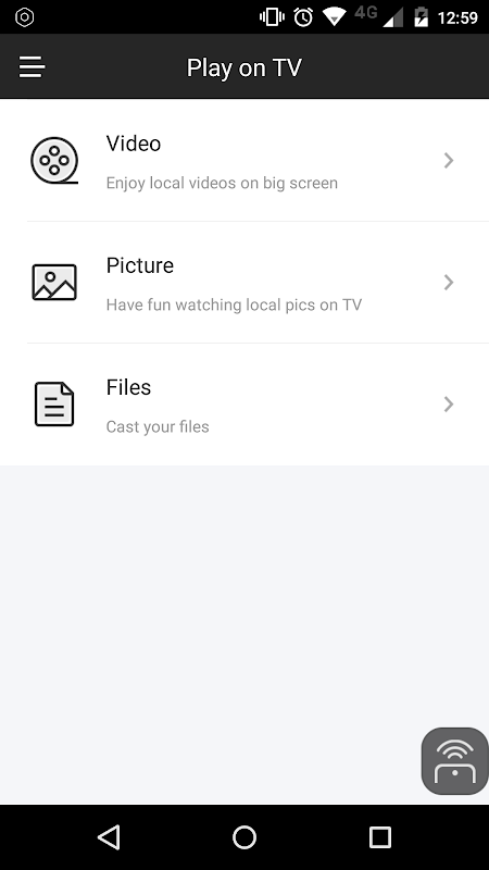 • Cast your local files(photo, videos, DOC, XLS, PPT, TXT, etc.) from your phone to TV