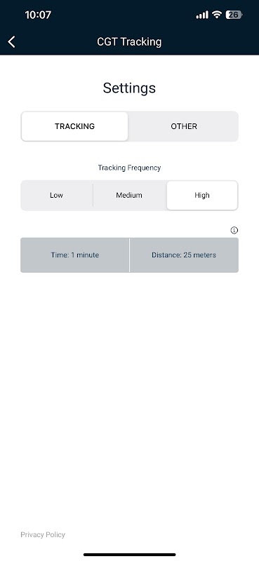 The frequency of reporting to CGT Tracking is determined by selecting the appropriate risk profile in the CGT Tracking settings. Triggering a panic and sending a check-in, message or image will send a location report to SicuroTrack Platform.