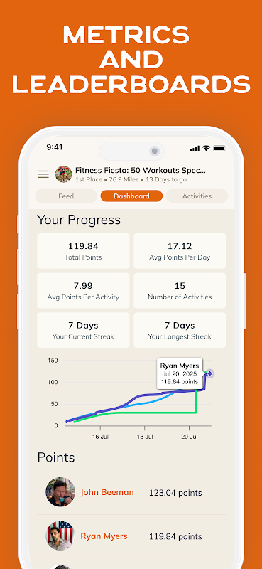 - Each challenge includes dynamically updated personalized progress metrics, charts and leaderboards.