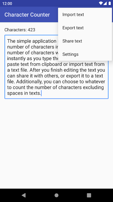 Character Counter is a simple application used to count the number of characters in texts easily. Character Counter will display the number of characters instantly as you type the text. Character Counter can also count the number of characters excluding spaces easily.